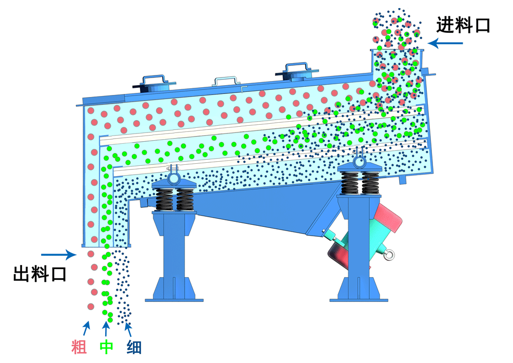 直線運動振動篩借助振動電機產生的激振力,驅動篩箱做定向直線往復運動,以此實現物料篩分。工作時,物料從進料口均勻進入篩面,在篩箱的直線運動作用下,沿著篩面持續向前移動。篩網有1-5層可選,通常1層是簡單的除雜,2-3層篩網能將物料分為3-4個粒度等級,從而完成粗、中、細的篩分需求,4-5層篩網主要完成物料的精細化分級。通過這種直線運動主導的分級方式,可完成2-6個粒度等級的物料分離。
