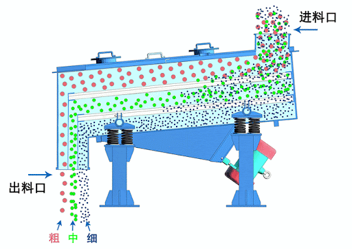 工業廢料振動篩工作時,我們從進料口位置將廢料投入篩機內部,可以人工投料,也可以對接上游設備自動投料,在雙振動電機的驅動下產生的振動力傳遞到篩面,廢料受振動力影響在篩面上被拋起或向前做直線運動,小于篩孔的廢料通過篩上,成為篩下物料,大于網孔的廢料被攔截從當前出料口排出,這樣就完成了廢料的篩分,分級。